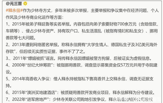 要知道根据娱乐圈的塌房定律,如果是假的直接辟谣就好,只有是真的才会先挂断电话,再语焉不详。 这下网友炸锅了,很多业内人士也纷纷发声,猜测释永信为何忽然会被带走。要知道释永信担任少林寺方丈这么多年,可不止第一次卷入纷争。早在十多年前,他就被弟子控诉了。网友盘点了释永信这些年卷入的纷争,一共7次卷入漩涡。