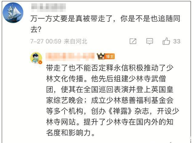 该博主还表示就算释永信被带走了,也不能否定他积极推动了少林文化的传播。释永信先后组建少林寺武僧团,使其在全国巡回表演并登上英国皇家综艺晚会;成立少林慈善福利基金会等多个机构,创办《禅露》杂志;开设少林寺网站。提升了少林寺在国内外的知名度和影响力。